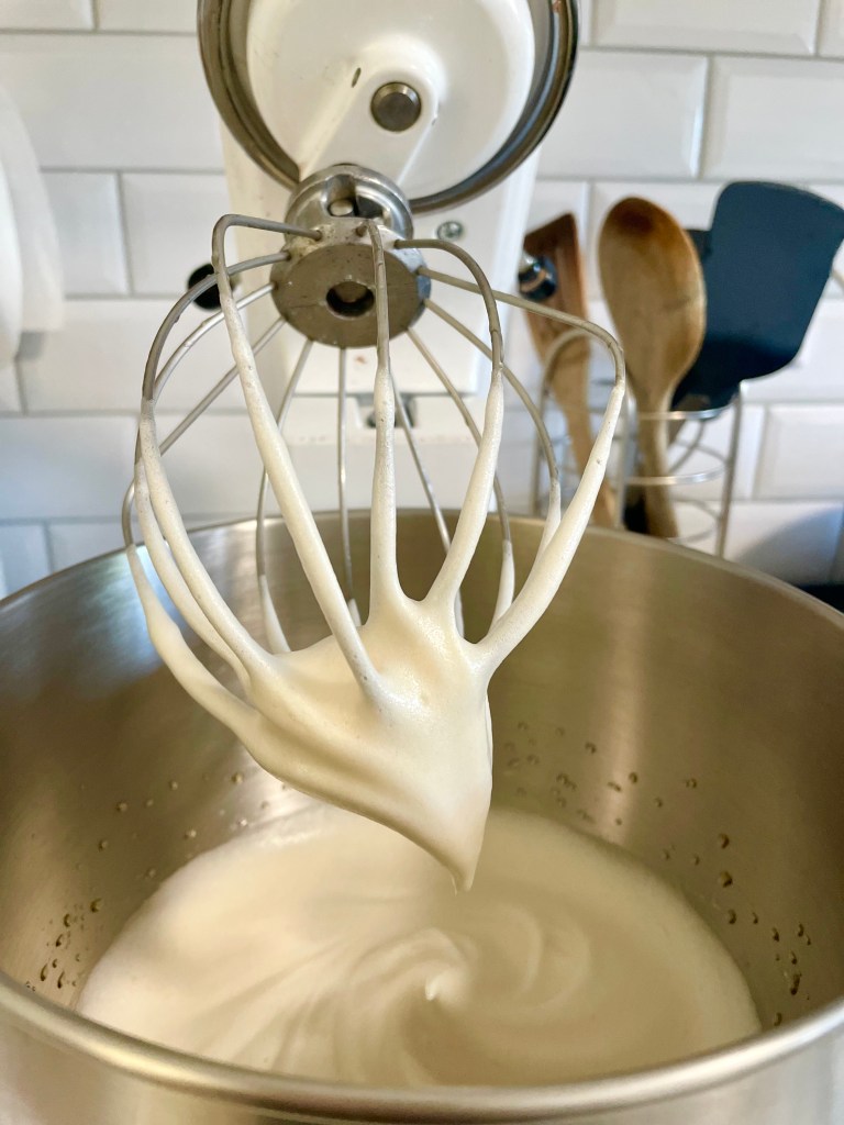Once the honey mixture reaches a simmer, remove it from the heat. While whipping the egg whites on low speed, slowly and steadily pour the honey mixture down the side of the bowl, maintaining a consistent pour.