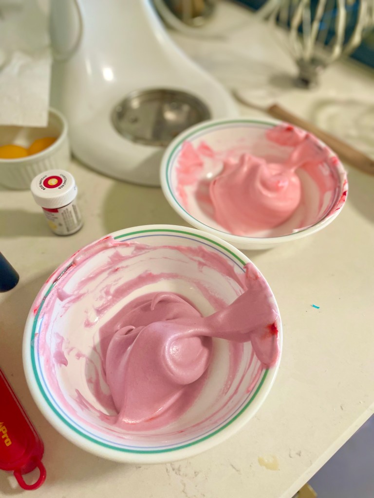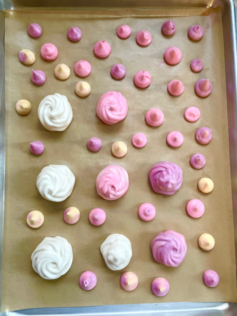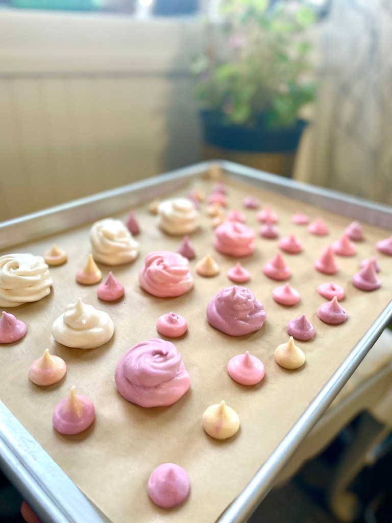 Once the honey is fully incorporated, add the vanilla extract. You can also add food coloring at this point if you would like. Transfer the mixture to a piping bag with a tip or use spoons to dollop it onto the prepared baking tray. Pro tip: use a bit of the mixture at each corner of the parchment paper to keep it in place.